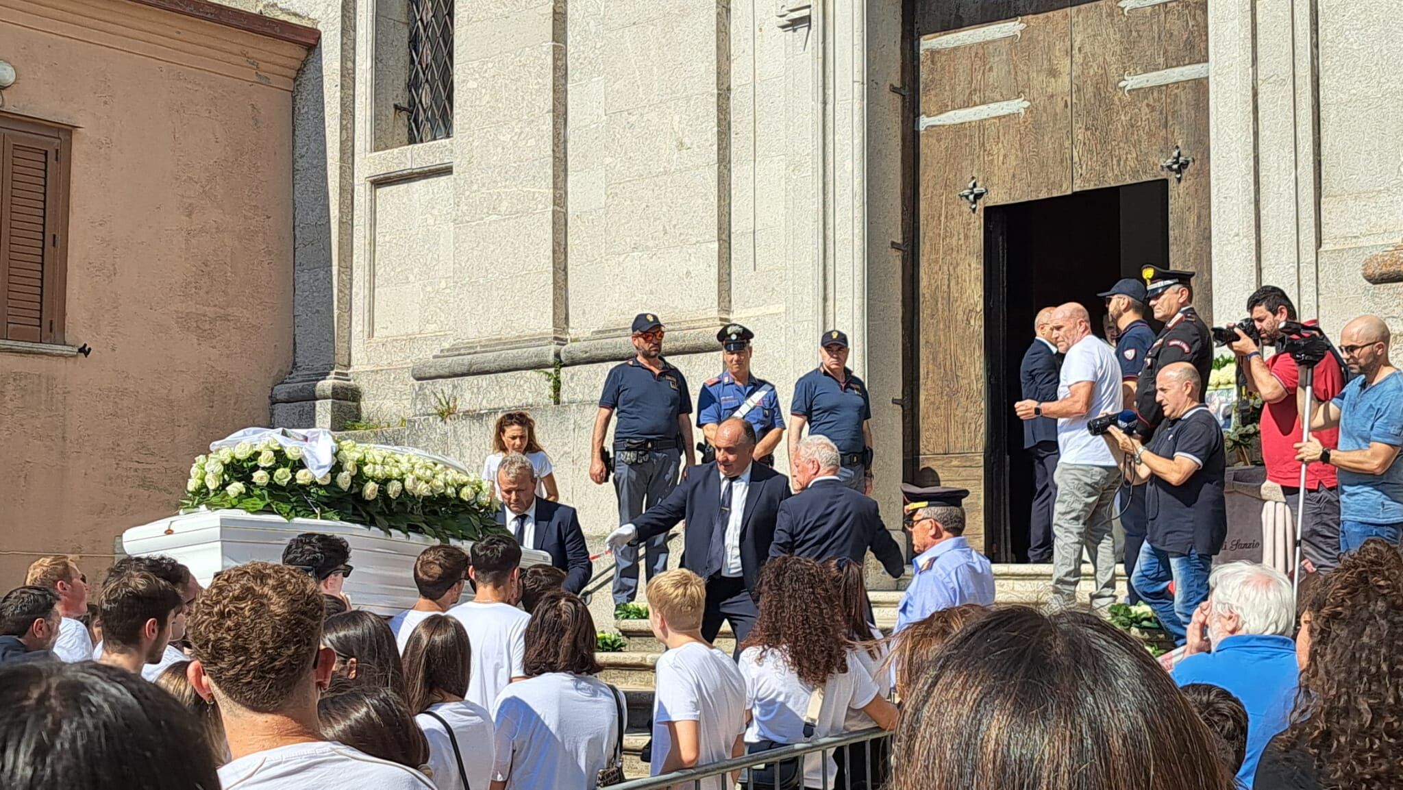 In mezzo, nelle vie del paese, avanza la bara bianca. Coperta di fiori, portata a spalla dagli amici di sempre, che si danno il cambio. Il corteo arriva in cattedrale dove altra gente aspetta per salutare Francesco per l'ultima volta. Per chi non è riuscito a entrare in chiesa, all'esterno, scorrono le immagini della funzione funebre, su un maxi-schermo.