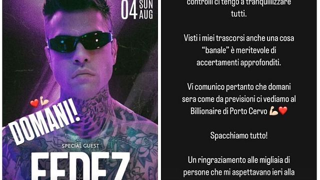 “Dopo una giornata di riposo e di controlli, ci tengo a tranquillizzare tutti. – scrive Fedez sui social – Visti i miei trascorsi anche una cosa banale è meritevole di accertamenti approfonditi. Vi comunico pertanto che domani sera (domenica 4 agosto, ndr) come da previsioni ci vediamo al Billionaire di Porto Cervo. Spacchiamo tutto! Un ringraziamento alle migliaia di persone che mi aspettavano ieri alla Praja di Gallipoli, promesso ci vediamo presto”.