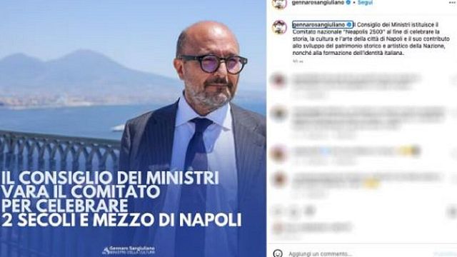 "Il consiglio dei ministri vara il comitato per celebrare 2 secoli e mezzo di Napoli", questa frase scritta in un'immagine postata sul profilo Instagram del ministro della Cultura Gennaro Sangiuliano è costata il posto al suo social media manager. La città di Partenope festeggia infatti 2500 anni e non 250 come appare nel post. La card, rimasta online solo qualche minuto, ha subito fatto gridare a una gaffe del ministro, ma lo staff replica: "I social non li gestisce lui di persona, ma c’è un addetto". Poco dopo sull'account X di Sangennaro è arrivato l'annuncio: "L'errore sul profilo Instagram relativo alla nascita del Comitato nazionale 'Neapolis 2500' evidentemente è del mio social media manager. Per questo ho accettato le sue dimissioni".
