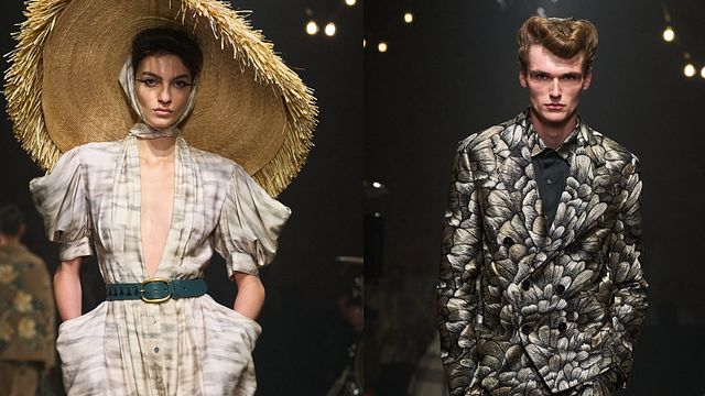 Evocativa e contemporanea, questa collezione SS25, donna e uomo, è un sovrapporsi di tessuti e materiali, ricami preziosi, pizzi delicati, frange e stampe che si rincorrono tra loro, si incontrano e si amalgamano. I decori si arricchiscono di jais e paillettes, fiocchi e volant. Le silhouette sono riconoscibili, gli abbinamenti inusuali: gli opposti si attraggono, niente è come sembra. Ecco, allora, le sete leggere drappeggiate come abiti couture, il jeans trattato come la pelle, che a sua volta è stampata come un tessuto. Rafia, intarsi, stemmi. Colpisce anche l'esplosione di colori luminosi, come il verde salvia, gli azzurri brillanti, i bordeaux intensi e i gialli fluo.