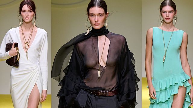 È una creatura che proietta se stessa nel presente, creativa e libera. Nella coscienza che a cambiare il mondo non sono i vestiti ma le donne che li indossano. La libertà degli abbinamenti: la joie de vivre e la leggerezza delle camicie over, bianche, morbidissime, con la gonna in raffia. I bottoni delle giacche preziosi, con richiami anni '70, i cardigan ampi un po' maschili e i pantaloni comodi, anche a zampa, le cinture morbidissime. Menzione speciale per i gioielli in corno: un chiaro richiamo etnico, che convive perfettamente anche con i look più bon ton.