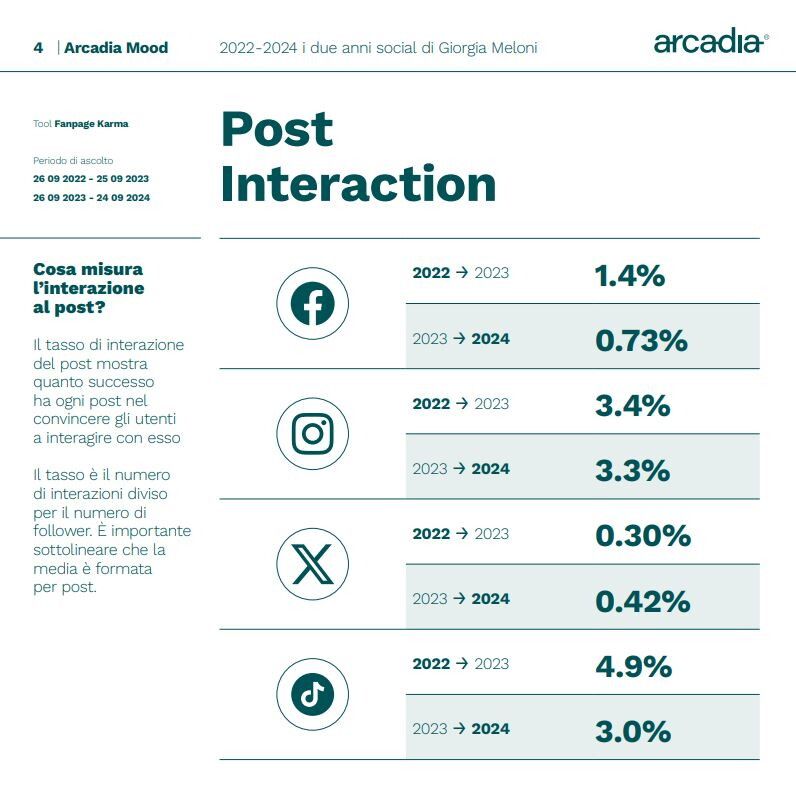 Entrando nel dettaglio del report, la premier ha guadagnato 98mila nuovi follower su Facebook dal 2023 al 2024, mentre l'anno prima ne aveva avuti 439mila in più. Su Instagram, invece, i nuovi follower per l'inquilina di Palazzo Chigi sono stati 1,5 milioni in più nell'ultimo anno, in crescita rispetto ai 968mila del 2022-2023. Su X, ancora, i "seguaci" in più sono stati 438mila nel 2023-2024 (+708mila nell'anno precedente). Su TikTok, invece, i nuovi follower sono stati 600mila nell'ultimo anno, mentre erano stati 1,1 milioni nel periodo 2022-2023. Le "total reactions" crescono su Instagram (37,8 milioni nel 2023-2024 contro i 26,4 milioni dell'anno precedente), X (6 milioni contro 4 milioni) e TikTok (8,1 milioni rispetto ai 5,7 milioni del 2022-2023) della premier mentre calano su Facebook ( 10,2 milioni contro i 19,5 milioni dell'anno precedente).