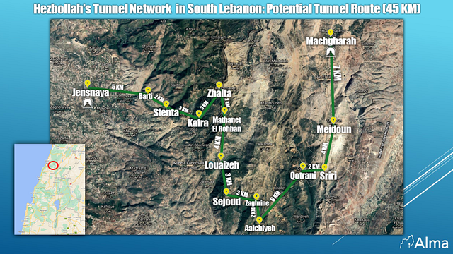 Come spiegato al Times of Israel da Tal Beeri, direttore del dipartimento di ricerca dell'Alma Research and Education Center ed ex membro dell'intelligence militare israeliana, il progetto dei tunnel libanesi è stato avviato molto prima rispetto a quello di Gaza. Le informazioni di intelligence esistenti indicano una vasta rete di tunnel nel Libano meridionale, profonda e multiforme. Diversi anni fa, Beeri era riuscito a rintracciare una mappa di quella che ha definito la "terra dei tunnel" nel sud del Libano. "La mappa è contrassegnata, da una parte sconosciuta, con poligoni (cerchi) che indicano 36 aree, città e villaggi", ha scritto in un articolo del 2021. "Nella nostra valutazione, questi poligoni contrassegnano i centri di stazionamento di Hezbollah come parte del piano di difesa contro un'invasione israeliana del Libano. Ogni centro di stazionamento locale possiede una rete di tunnel sotterranei locali. Tra tutti questi centri, è stata costruita un'infrastruttura di tunnel regionali interconnessa". Una sorta di "metropolitana" della guerra, con tutte le strumentazioni per affrontare le ostilità. Il report degli analisti ha ricostruito il percorso, lungo 45 chilometri, di un "tunnel di attacco" che corre sotto il Libano meridionale.