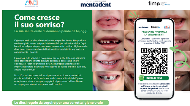 Si aggiunge poi il lancio del test “Come cresce il suo sorriso?” che, in continuità con le 10 regole d’oro contenute nel Manifesto e completo di video pillole di approfondimento – rappresenta uno strumento concreto che permette di ottenere, rispondendo a poche e semplici domande, un valido riscontro, fondato su basi scientifiche, su cosa sia necessario migliorare nella routine di igiene orale dei piccoli di casa. Il test, rivolto alle famiglie, si aggiunge a quello sviluppato lo scorso anno - “Quanti anni ha il tuo sorriso?” - creando così uno spazio affidabile in cui gli italiani possono trovare informazioni utili su tutto ciò che riguarda la Prevenzione, attraverso un linguaggio innovativo e coinvolgente. Alla fine di entrambi i test, quello per i più piccoli rivolto ai genitori, così come quello dedicato agli adulti, gli utenti verranno indirizzati verso una mappa interattiva che, semplicemente inserendo il proprio CAP, permette di trovare i dentisti – associati ANDI e aderenti all’iniziativa – più vicini e di contattarli per prenotare una visita di controllo.