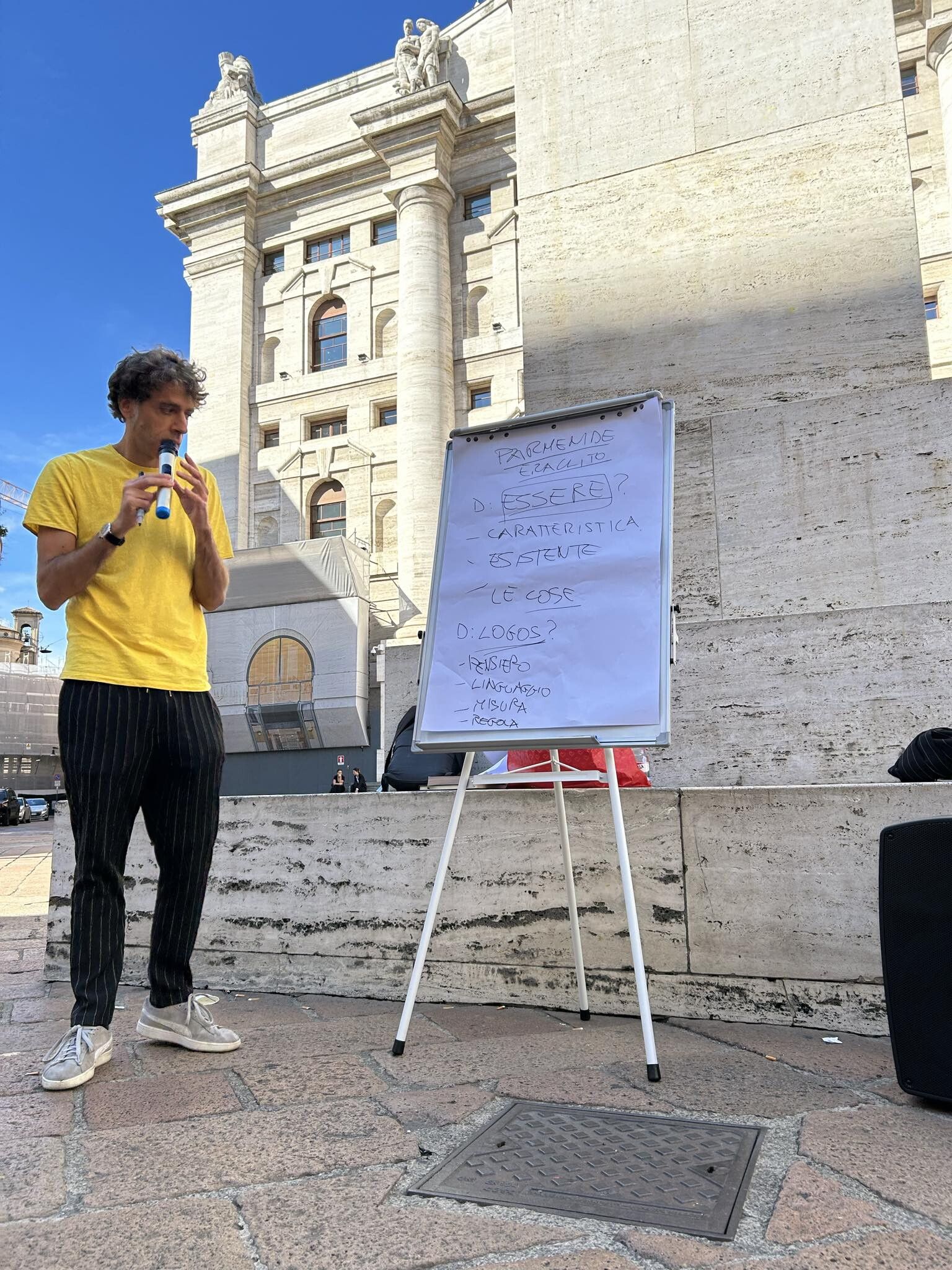 Domenica prossima, ci sarà una lezione alle 17 in Piazza Affari. Invece, il 20 una a Cabiate (Como), in una scuola d'arte (si tratta di un evento aperto a tutti). Inoltre, sabato, parteciperò come relatore al Festival dell'Umano della Fondazione Andrea Pezzi. Comunque, farò lezioni in piazza all'infinito. Questa modalità esisteva 2.500 anni fa e, ora che l'ho riportata in auge, sarebbe assurdo smettere. Almeno facciamola durare un altro migliaio di anni.