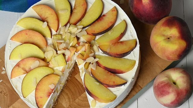 Decora con le fette di pesca tagliate sottili e disposte a raggiera, cospargi con le rimanenti mandorle e riponi in frigorifero per almeno quattro ore prima di tagliare la cheesecake e servire.