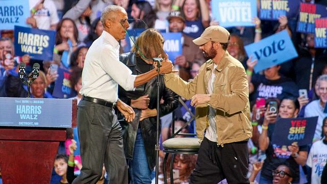 A meno di due settimane dal voto le superstar scendono in campo a sostegno di Kamala Harris. E a Detroit, sua città natale, Eminem è salito sul palco di un comizio per la campagna presidenziale della vicepresidente, con Barack Obama, che è arrivato rappando al ritmo di "Lose Yourself" dello stesso Eminem. "Per favore andate a votare" ha detto il cantante alla folla.