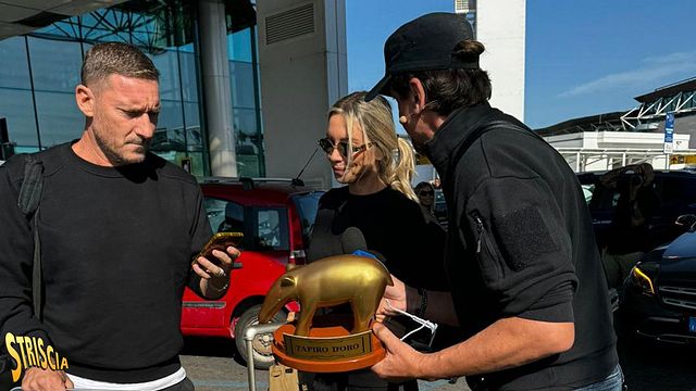 "Striscia la Notizia" consegna il Tapiro d'oro a Francesco Totti, beccato dai fotografi giorni fa mentre usciva da un hotel capitolino con la giornalista Marialuisa Jacobelli.