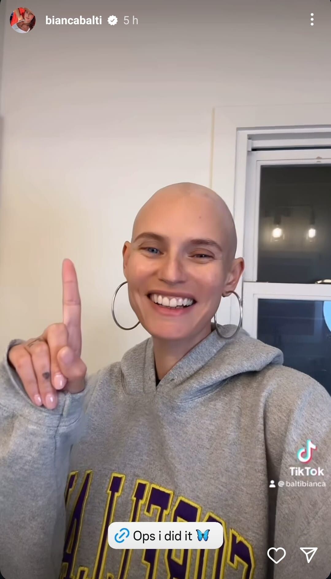 Bianca Balti si mostra per la prima volta sui social senza capelli. La modella, che sta affrontando la chemioterapia dopo l'operazione per un tumore ovarico, ha postato un video su TikTok - poi condiviso nelle storie di Instagram - in cui appare prima con i capelli corti e poi calva. "Once a bad b**ch… always a bad bitch" ("Una volta stron*a... sempre stron*a"), ha scritto Balti nella didascalia a corredo del post.