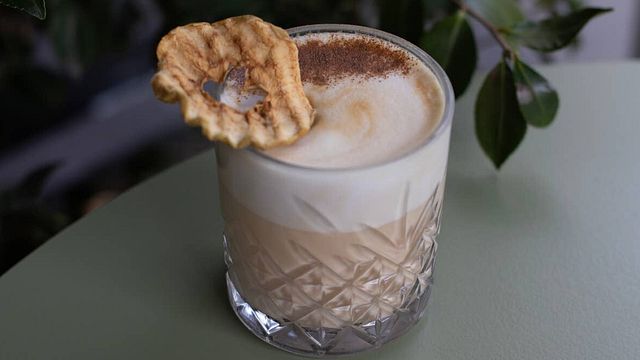 Preparare lo sciroppo versando in una casseruola il succo di mela, lo zucchero e la cannella. Portare a ebollizione e mescolare per circa 15 minuti finché non avrà raggiunto una consistenza densa. Unire 30 grammi dello sciroppo ottenuto con il caffè espresso, la bevanda all’avena montata e decorare con una spolverata di cannella e una fettina di mela essiccata.