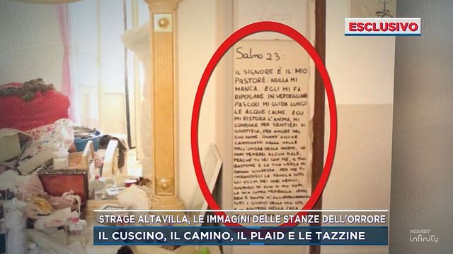 Sulla parete, dietro il divano, un salmo scritto con un pennarello nero. Stessa scena si ritrova anche in altre stanze. Accanto all'orologio, inoltre, c'è una frase: "Per tutte le cose c'è un tempo fissato da Dio". Il corpo di Emanuel, invece, è stato rinvenuto in un'altra stanza: si tratta di una camera decisamente in disordine. Il piumone a terra, sul letto una scatola aperta, affiancata da un ammasso di vestiti e un telo bianco. Anche nell'altra camera da letto regna la confusione, così come nella cucina: sul tavolo ci sono cibo e bevande per di quella settimana. Secondo la ricostruzione degli inquirenti sarebbe stato lo stesso Barreca a fare quella spesa, andando più volte al supermercato durante quei giorni di torture. Infine, frammenti di tazzine e di una scatola per biscotti sono stati rinvenuti nei pressi della buca dove sarebbe stata sepolta Antonella Salamone, la moglie di Barreca. Oggetti che avrebbero fatto parte del brutale rituale che ha spezzato le vite di questa famiglia.