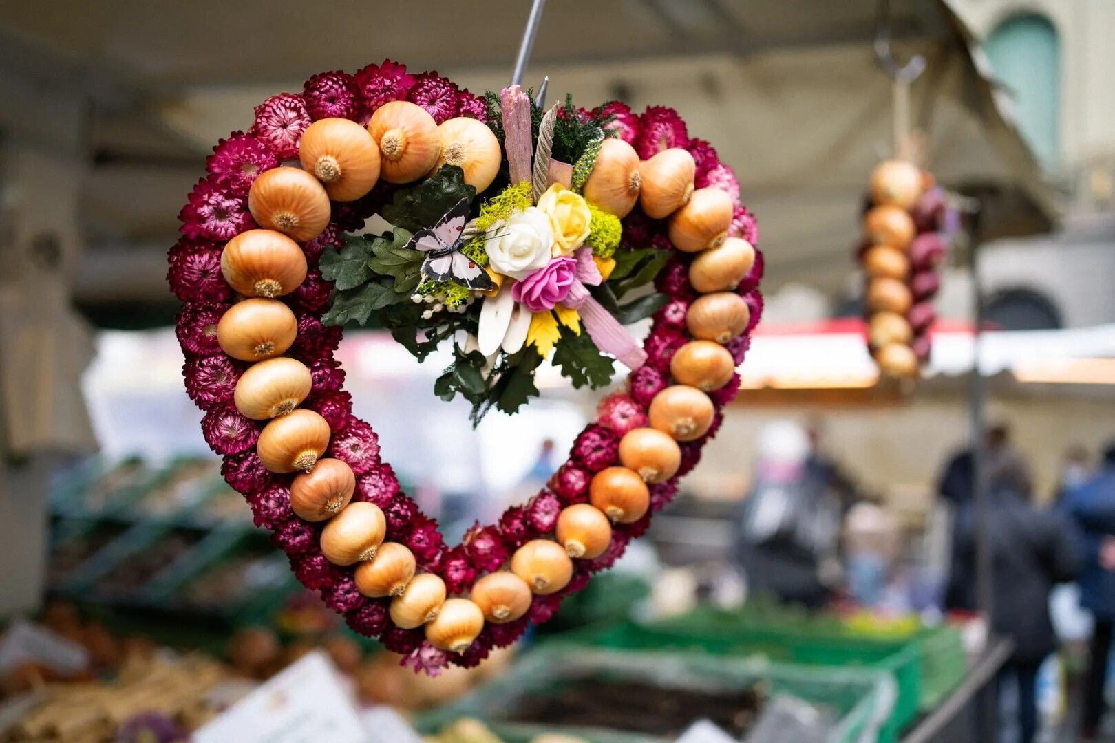 CIPOLLE E NON SOLO - oltre 50 tonnellate di cipolle intrecciate in modo artistico coloreranno il centro della città e saranno anche disponibili una vasta gamma di prodotti correlati: dalle cipolle caramellate a gustosi piatti a base di cipolla, come la celebre Zibelechueche (torta di cipolle) oltre al pane all’aglio profumato, i bratwurst, Rösti e Glühwein, il tipico vin brûlé speziato, e altre bevande calde.