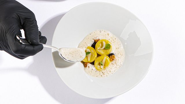 Un momento distintivo del menù è l’intermezzo rappresentato da Pane, “miele” e burro salato, in cui il miele è in realtà ottenuto dal pane vecchio, grazie al processo di amilasi che scompone gli amidi. È un gesto che trasmette l’importanza del recupero e dell’innovazione, in cui la dolcezza naturale del miele incontra l’aroma dell’anice stellato.