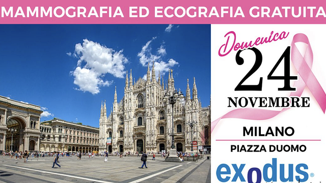 Domenica 24 novembre, in Piazza Duomo a Milano, dalle 9 alle 18.30, in occasione dell'evento "Spazio della Solidarietà" organizzato per celebrare il 40° anniversario della Fondazione Exodus di Don Antonio Mazzi, sarà possibile accedere gratuitamente a esami specifici per la prevenzione del tumore al seno, grazie alla clinica mobile allestita da Progetti del Cuore, con HOPE.