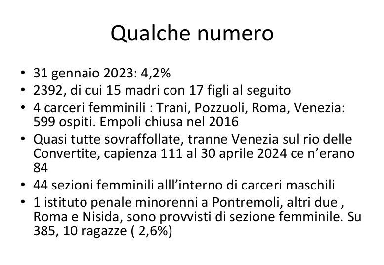 Una società contadina degli anni '30 - Il filo conduttore delle cifre e delle esperienze raccontate è lo stesso: in carcere ci si è fermati alla società contadina degli anni '30. Dalla pubblicazione di quel rapporto nel 2023 a oggi nulla è cambiato, nonostante la acclarata discriminazione all'interno delle strutture detentive e nonostante i tanti tentativi di "normalizzazzione" portati avanti da associazioni e "addetti" ai lavori. Tutto fermo. Le sezioni femminili restano inadeguate, le attività professionali sono poco variegate, ii percorsi scolastici sono diversi per uomini e per donne e la mancanza di tutele per madri e figli in carcere è rimasta immutata.