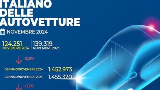 A novembre 2024 il mercato italiano dell’auto ha totalizzato 124.251 immatricolazioni, in ribasso del 10,8% rispetto a novembre 2023, che aveva registrato 139.319 unità, con una giornata lavorativa in più. Nei primi undici mesi del 2024 i volumi complessivi si attestano a 1.452.973 unità, pressoché in linea con quelli di gennaio-novembre 2023 (-0,2%). Rispetto al periodo pre-covid, gennaio-novembre 2019, il calo è del 18,2%.