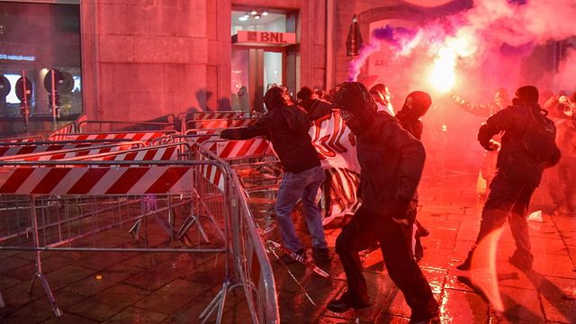 Vicino a piazza della Scala i manifestanti del corteo milanese contro la guerra hanno lanciato petardi e fumogeni oltre le transenne che delimitano la "zona rossa" in via Santa Margherita. Gli attivisti si sono avvicinati nascosti dietro a uno striscione. Subito dopo, sono ripartiti verso largo Cairoli dove dovrebbe terminare la manifestazione. L'area è presidiata dalle forze dell'ordine.
