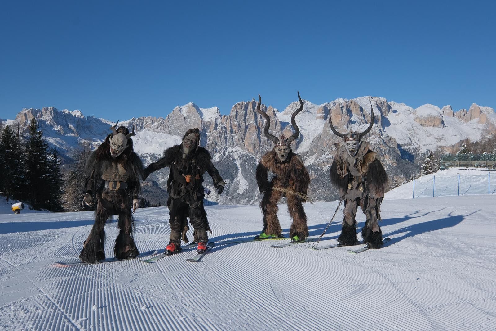 I Krampus, secondo la leggenda, sono esseri demoniaci sconfitti da San Nicola e quindi costretti a servirlo: alla vigilia della festa dedicata al Santo, quindi il 5 dicembre, sfilano tra grande rumore e qualche dispetto per ricordare a tutti che il male esiste, anche se viene sconfitto dal bene. Per mantenere viva la tradizione, un chiassoso gruppo di Krampus sciatori è partito dalla stazione a valle della cabinovia Pozza-Buffaure, creando scompiglio e divertimento lungo i tracciati delle due aree sciistiche, salendo fino a Col de Valvacin e spostandosi poi verso Sella Brunech per una pausa nella conca del Ciampac, vista Gruppo del Sella, tra selfie e scatti panoramici. Non è mancato un siparietto musicale, con le affascinanti maschere accompagnate dalle note della fisarmonica, presso Baita Cuz.