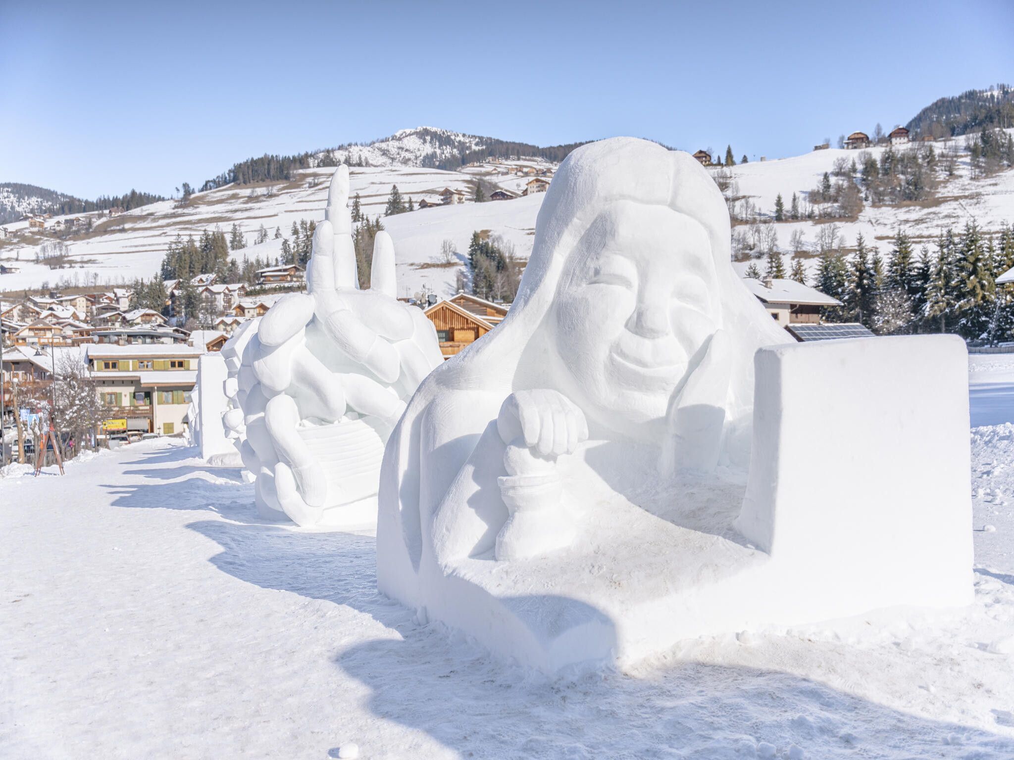 Il Dolomites Snow Festival, senza dubbio uno degli eventi di punta dell’inverno, attira ogni anno numerosi ospiti internazionali, con la sua combinazione di creatività, legame con la natura e magia invernale. Ogni squadra partecipante, composta da tre artisti, ha a disposizione un semplice blocco di neve pressata e gelata a forma di cubo con il lato di tre metri, da trasformare in bianco capolavoro nel tempo limite di tre giorni, utilizzando semplici attrezzi come piccozze, palette, filo spinato, seghe, una scala e un secchio per l’acqua. L’elettronica è bandita, si utilizza solo l’abilità delle mani e la forza delle braccia. Le sculture che vengono realizzate con questi pochi mezzi sono semplicemente stupefacenti: non rappresentano solo un’espressione di creatività e di arte, ma sono anche un omaggio alla natura e alle fragili risorse del nostro pianeta, perché il festival ripropone ogni anno il connubio di arte, consapevolezza ambientale e magia dell’inverno.