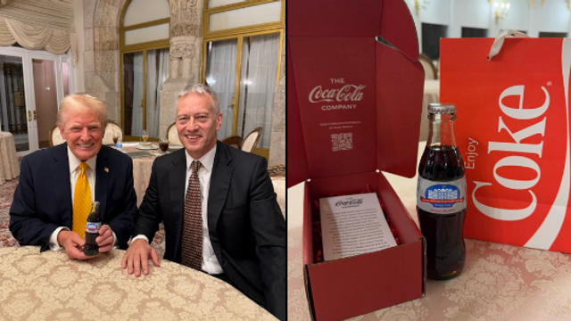 Coca-Cola è l'ultimo big della Corporate America ad allinearsi a Donald Trump, e realizza una bottiglia speciale per il suo insediamento. Il Ceo dell'azienda, James Quincey, ha consegnato al tycoon la prima "bottiglia commemorativa presidenziale" di Diet Coke, con l'etichetta dedicata "all'insediamento del presidente degli Stati Uniti Donald J. Trump" e la data, "20 gennaio 2025".