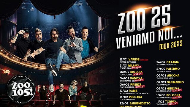 Con Milano, l’appuntamento di “Zoo 25, veniamo noi” è aggiornato al 17 marzo, sempre agli Arcimboldi. Un appuntamento però già definito nella partecipazione, perché i biglietti sono esauriti anche per questa seconda data, così come per la maggior parte degli spettacoli che comporranno la tournée. Dal 3 febbraio a Brescia al 20 marzo a Piacenza, un su e giù per l’Italia che si sta già trasformando in uno degli eventi teatrali dell’anno. Questa la lista delle date previste: