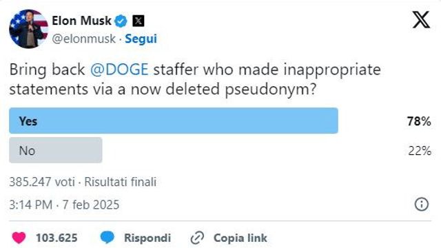 Prima costretto alle dimissioni per post razzisti e poi reintegrato per direttissima dopo un sondaggio lanciato su X: è il caso di Marko Elez, luogotenente del Doge (il Dipartimento per l'Efficienza governativa) diretto da Elon Musk. Uno dei "baby nerd", lo chiamano negli Usa, assoldati dal magnate visionario entrato nell'amministrazione Trump. "Solo per la cronaca, ero razzista prima che diventasse di moda", "non potresti pagarmi per sposare persone di un'altra etnia", "normalizza l'odio verso gli indiani": sono alcuni dei post "incriminati" che hanno costretto Elez a lasciare l'incarico. "Devo riassumerlo?", ha chiesto Musk ad americani e utenti di X, lanciando un sondaggio sulla piattaforma. Il "sì" ha vinto con il 78% dei voti. E dunque il direttore del Doge ne ha annunciato il reintegro, con il beneplacito del presidente Donald Trump.