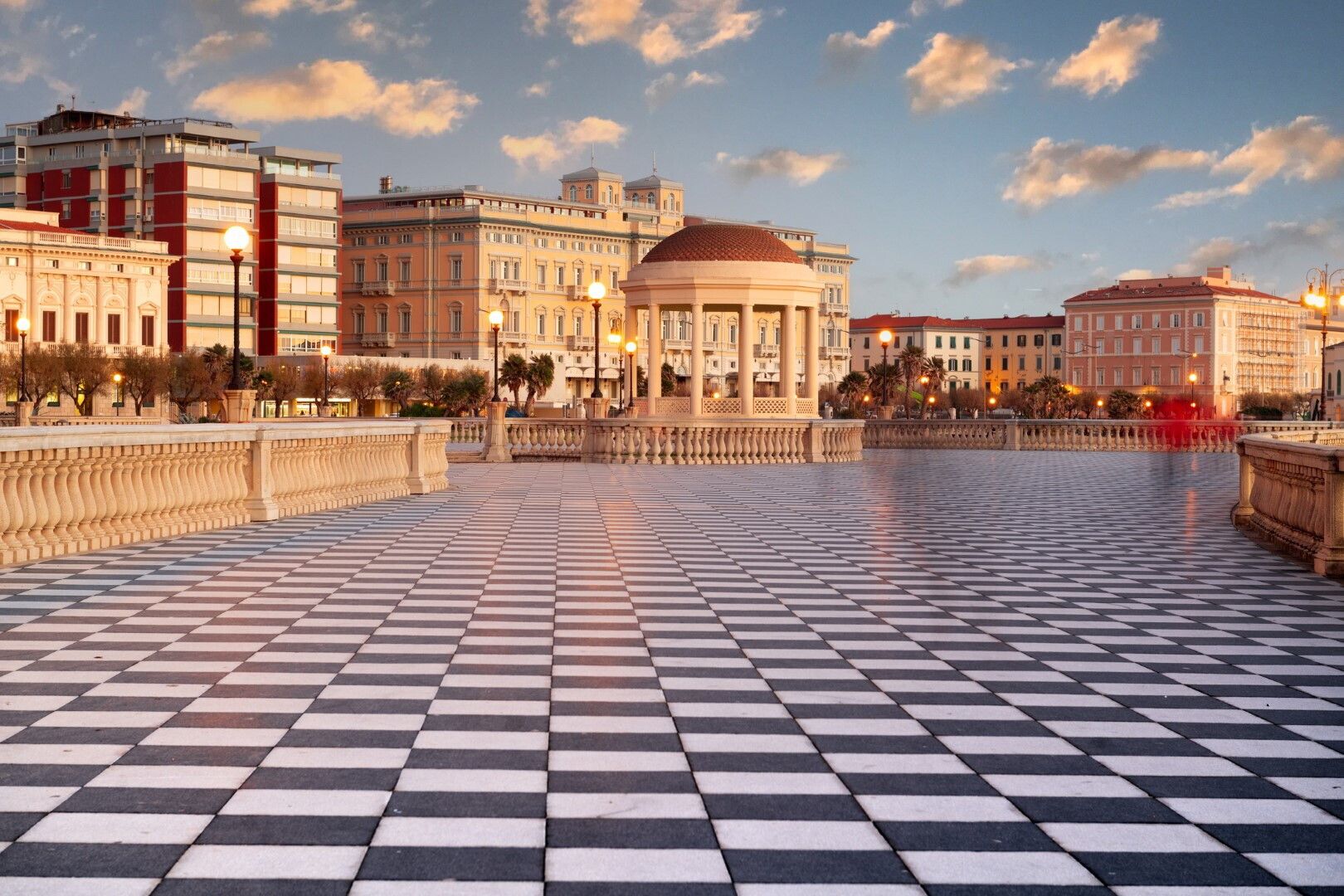 Livorno, una grande scacchiera interrotta solo dall’azzurro del mare. Quel bianco e quel nero che ricordano i tasti di un pianoforte o lo spartito della Cavalleria Rusticana di Pietro Mascagni, di cui la celebre terrazza porta il nome. Si alternano, le piastrelle, nella stessa maniera ipnotica e commovente, precisa e ordinata, che trova poi sfogo nell’anarchica increspatura delle onde del mare, spazzate dal vento come in un tramonto di Giovanni Fattori.