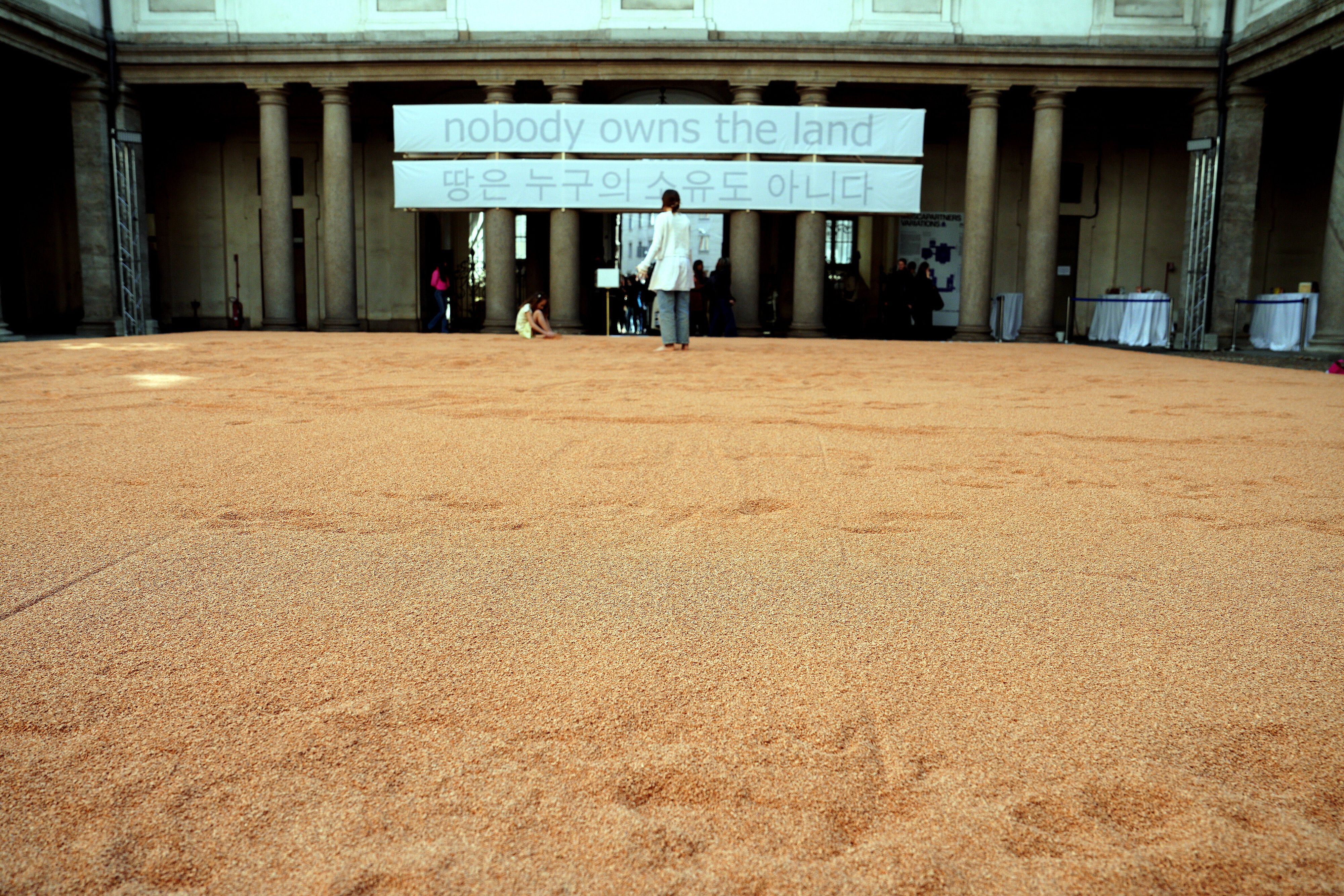 Ad accogliere i visitatori nel Cortile d’Onore sarà "Nobody Owns the Land: Earth, Forest, Mahk", opera site-specific dell’architetto coreano Byoung Soo Cho. Un’installazione poetica e potente che riflette sul rapporto tra uomo, architettura e natura, fungendo da preludio al tema della mostra. Al centro della corte seicentesca, delimitata da un colonnato, emerge Earth, primo elemento dell'opera: una piattaforma sospesa, una forma geometrica ricoperta di terra rossa in contrasto con il cielo blu di Milano. Il significato di questo lavoro si svela nel momento storico attuale, in cui la terra è oggetto di conflitto: lo spazio creato diventa un'occasione di meditazione. Il visitatore è invitato a salire, scalzo, sulla superficie sospesa, per sentire la terra sotto i piedi e vivere un'esperienza sensoriale diretta.