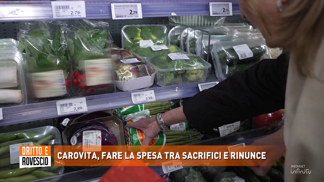 Caterina, accompagnata dalla troupe di "Dritto e Rovescio", si reca al supermercato per comprare alcuni prodotti alimentari con un budget di circa 30 euro. La donna come verdura sceglie gli asparagi e spiega: "Un mazzo costa 5,49 euro, sono aumentati almeno di 1,50 euro. Prendiamo anche un po' di insalata e queste pere che costano 5 euro al chilo con un aumento di circa 1 euro". A sorprendere Caterina è anche il costo dell'uva: "Come si fa a comprare a 5,99 al chilo? Prima degli aumenti te la tiravano dietro".