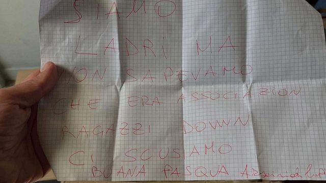 "Le colombe sono state realizzate e vendute nell'ambito del progetto "Work to walk" per l'inserimento lavorativo dei ragazzi. "Questo è uno di quei post - si legge sul social di Vita21 - che vorremmo scrivere ogni giorno! Qualche minuto fa convinti che fosse una scatola con della spazzatura accantonata da qualcuno di noi e dimenticata lì, abbiamo scoperto che invece conteneva 13 colombe tra quelle che erano state rubate. Su tutti un bigliettino con scritto: 'Siamo ladri ma non sapevamo che era associazione ragazzi Down ci scusiamo, buona Pasqua. Firmato Arsenio Lupin'. Non aggiungiamo altro. Siamo felici perché questo gesto possa rappresentare un nuovo inizio per queste persone. Se Vita21 è stata il tramite… Beh! Ne siamo orgogliosi. Buona Pasqua anche a voi! P. s.: però - si legge ancora - gli elettrodomestici vi hanno fatto comodo..."