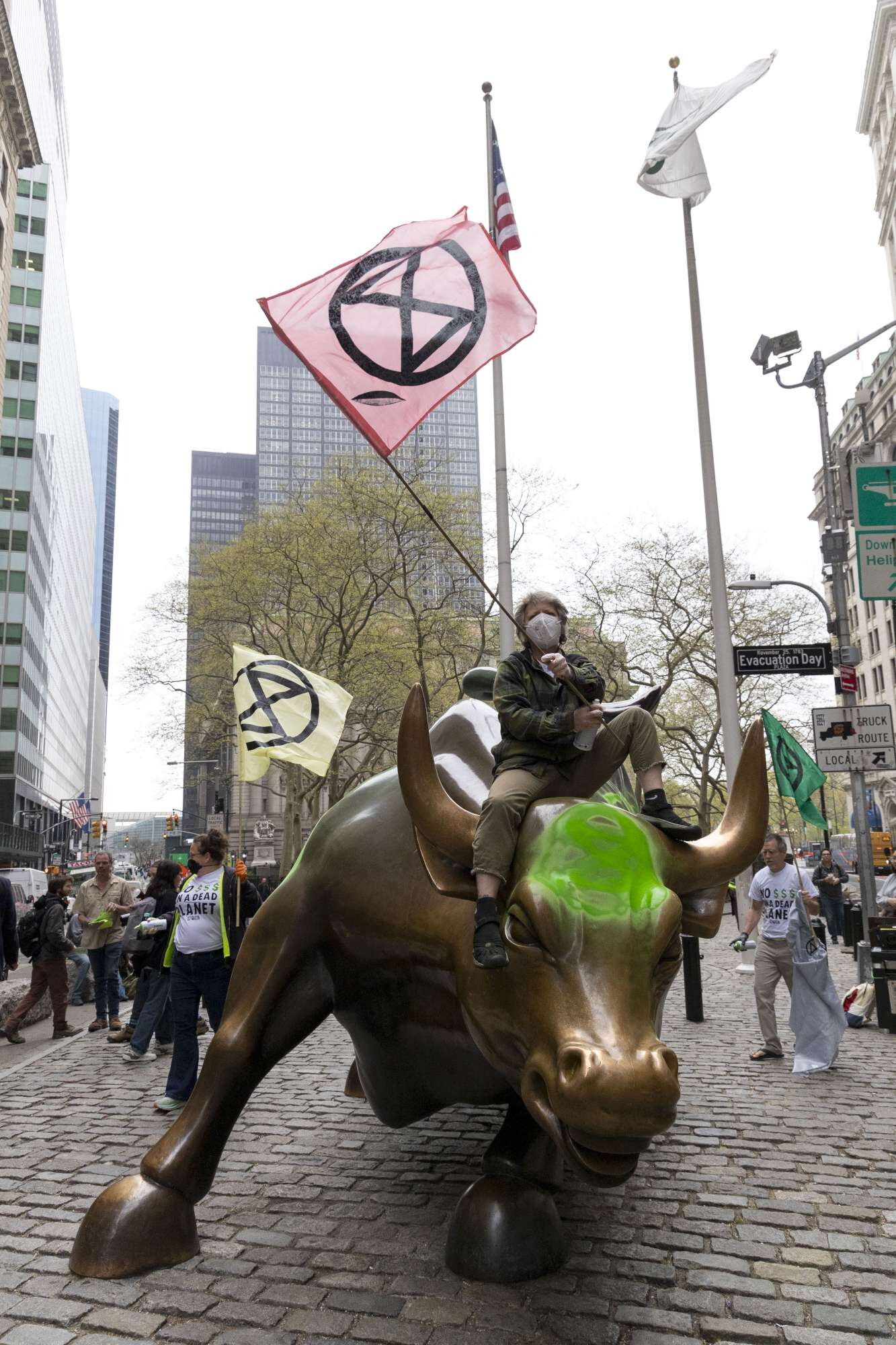 Due attivisti di Extinction Rebellion hanno vandalizzato la statua del Toro di Wall Street, nel parco di Bowling Green, vicino alla Borsa di New York. I due l'hanno imbrattata con vernice spray verde neon, scrivendo sul fianco Avidità=Morte e dipingendo di verde la fronte del Toro, simbolo della crescita del mercato azionario. L'atto vandalico è avvenuto nel giorno in cui si celebrava la 56esima "Giornata della Terra".