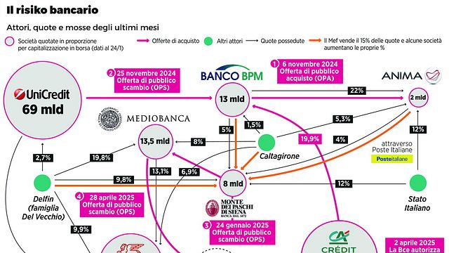 A gennaio 2025, Mps, salvata anni fa dallo Stato, ha sorpreso i mercati con una Ops ostile da 13,3 miliardi su Mediobanca. Con il Tesoro (11,7%), Delfin (9,8%) e Caltagirone (9,9%) tra i principali azionisti, Mps mira a rovesciare gli attuali equilibri della banca milanese. Il governo sembra aver benedetto l’operazione, vedendo in essa un'opportunità per consolidare il sistema bancario nazionale.