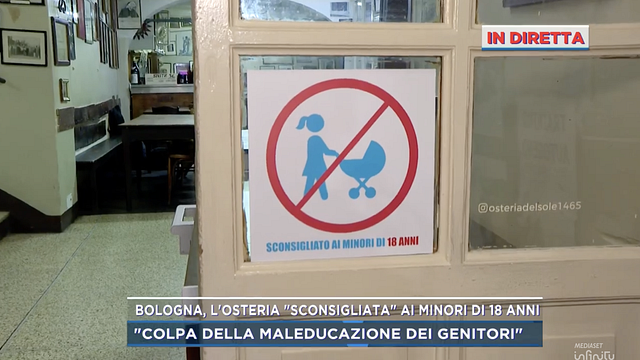 A Bologna il titolare dell'Osteria del Sole "sconsiglia" con un cartello l'ingresso ai minori di 18 anni, anche agli stranieri. "Non abbiamo nulla contro i bambini, questa è una storia legata alla maleducazione dei genitori, serve buonsenso. I bambini vanno tenuti a tavola educatamente" dice il titolare all'inviato di "Mattino Cinque News".