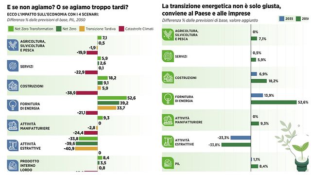 Un Pil più alto dell’1,1% nel 2035 e dell’8,4% nel 2050, rispetto allo scenario base, con dinamiche positive per l’industria, l’agricoltura e i servizi, disoccupazione più bassa, riduzione del debito pubblico, nonostante l’aumento degli investimenti: sono solo alcuni degli effetti positivi per l’Italia se si decidesse di accelerare la transizione ecologica e digitale.