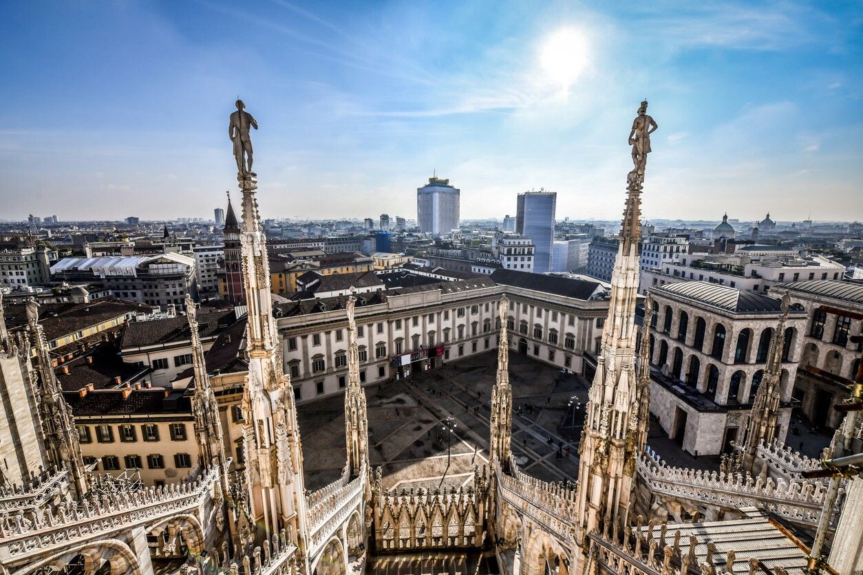TERRAZZE DEL DUOMO, MILANO – Ci si arrampica lungo un’antica scalinata, oppure si sale con un moderno ascensore, fino alla terrazza panoramica: da lì, attraverso una foresta di guglie di marmo, si ammira la piazza sottostante o si lascia correre lo sguardo sull’intera città. È questo uno dei punti più alti della città: per tradizione la statua della Madonnina si trova nel punto più elevato in assoluto di Milano. Per non infrangerla, i moderni grattacieli che superano i 108,50 metri d’altezza della guglia maggiore della Cattedrale, hanno alla sommità una riproduzione in piccolo della statua originale.