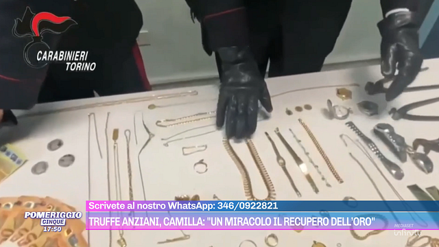 È una truffa dal lieto fine, ma che ha dell'incredibile, quella in cui è rimasta coinvolta la signora Camilla, 86enne residente a Novara. La donna è stata raggirata da alcuni malviventi che, fingendosi carabinieri, l’hanno convinta a consegnare loro tutti i gioielli e l’oro che possedeva. L’anziana, pur rendendosi conto dell’inganno, si era ormai arresa all’idea di non rivedere mai più i suoi oggetti preziosi, ai quali era legata non solo per il valore economico, ma soprattutto per quello affettivo. Circa venti giorni dopo, mentre stava cucinando, ha sentito al telegiornale che i carabinieri avevano recuperato diversi gioielli, smascherando un articolato sistema di ricettazione. Nella clip trasmessa in Tv, l'anziana ha riconosciuto chiaramente gli oggetti che le erano stati sottratti. Dopo essersi messa in contatto con le forze dell’ordine, è riuscita, con grande sorpresa, a recuperarli tutti. "Pomeriggio Cinque" raccoglie proprio la testimonianza di Camilla che racconta nel dettaglio l’intera vicenda.