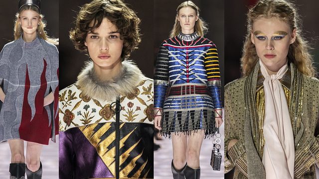 “Anche la moda, oggi ancora di più, ha la sua teatralità, il suo elemento di spettacolo e di spettacolarità”, ha spiegato Ghesquière. Minigonne e abiti che riflettono la luce, mantelle corte e casule sacerdotali, fili lamé e pelle goffrata, una cascata di pietre e gioielli incastonati negli stivaletti dalla punta aperta. A guardare la passerella, si ha la sensazione che per la creazione di ognuno dei 45 look presentati si sia attinto un po’ dappertutto: religione e glam-rock, ispirazioni cavalleresche e cultura pop. Si va da Giovanna D’Arco a Janis Joplin, da D’Artagnan a David Bowie: un mix and match tra storia e visioni futuristiche.