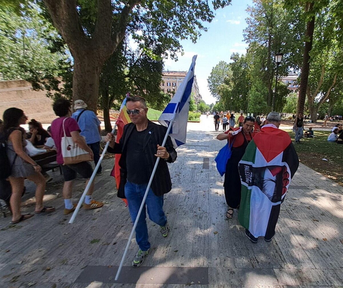 Il giornalista, indossando una kippah con i colori della pace e una spilla con la bandiera di Israele e sventolando una bandiera dello Stato ebraico e una della pace con la stella a cinque punte, aveva poi raggiunto la testa della manifestazione per Gaza.