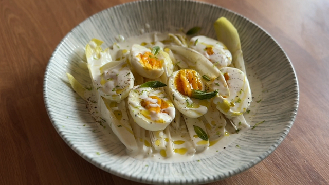 Cuocete le uova. Raffreddatele subito in acqua fredda e sgusciatele. Tagliatele a metà o a spicchi e disponetele sull’indivia.