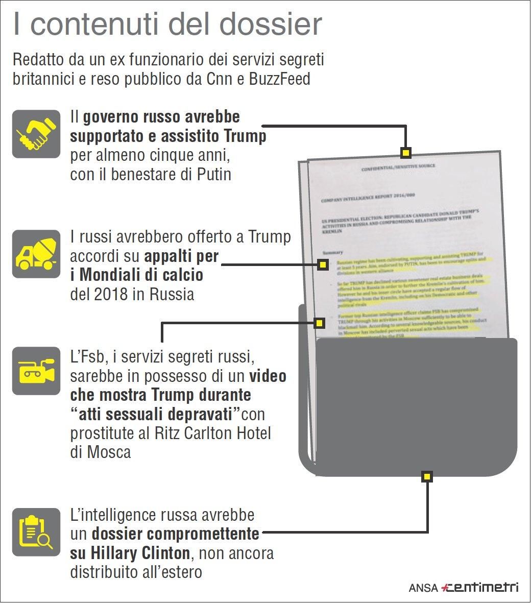 Affari loschi e festini 'hard'. E' bufera sulle presunte informazioni in mano alla Russia che comprometterebbero Donald Trump, a poco più di una settimana dall'ingresso alla Casa Bianca. A scatenare la bufera l'appendice di un rapporto consegnato dalle agenzie di intelligence a Barack Obama, allo stesso Trump e ai leader repubblicani e democratici del Congresso. Un documento di tre paginette basato in particolare sulle notizie di un ex funzionario dei servizi segreti britannici. Nelle carte top secret e per ora 'non verificate' - svelate nella versione integrale dal sito BuzzFeed e riprese dai media Usa - ci sono dettagli scottanti, e si parla in particolare di "atti sessuali perversi" di cui sarebbe stato protagonista il tycoon.
