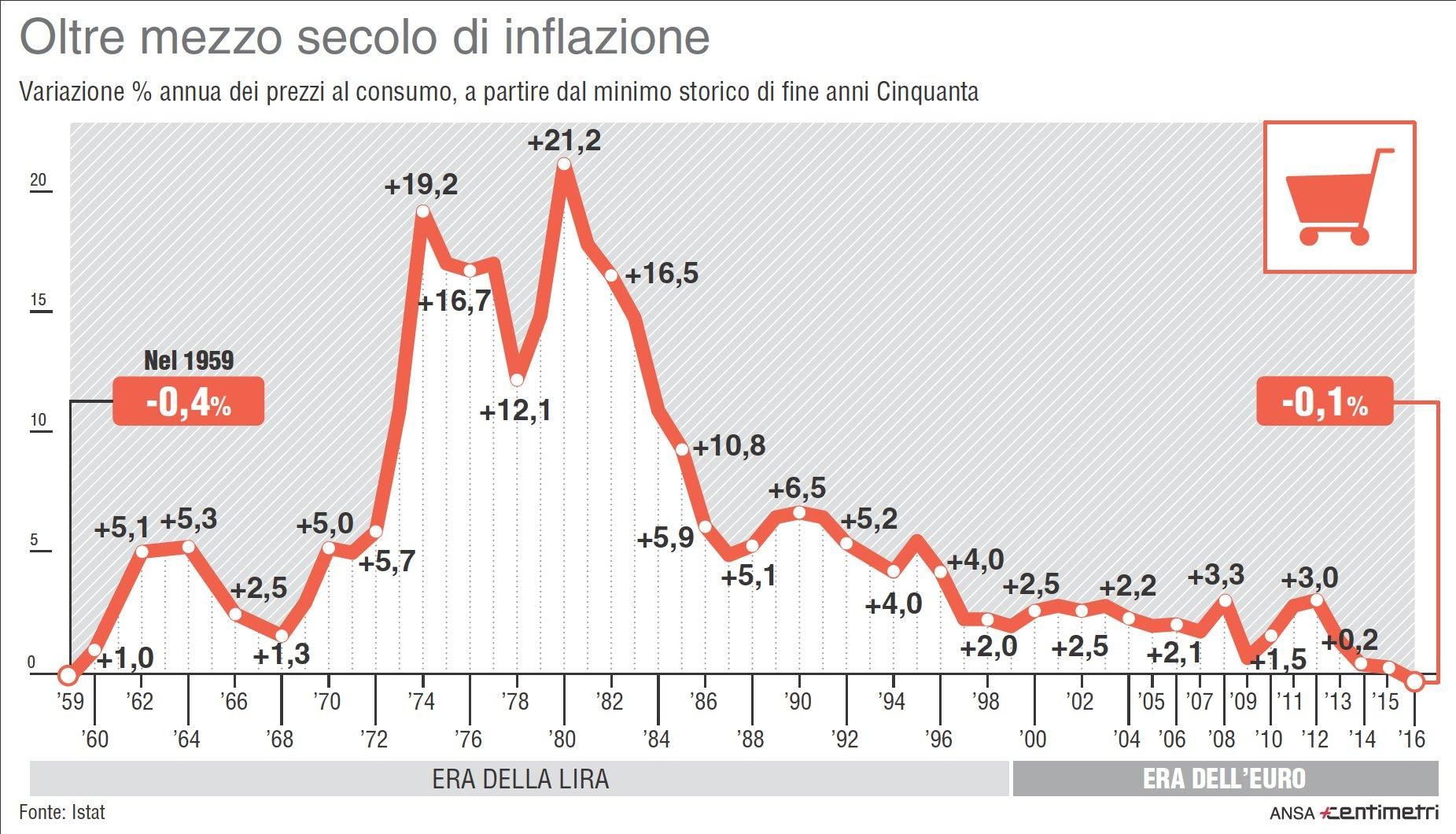 Italia in deflazione nel 2016. In media d'anno, i prezzi al consumo hanno registrato una variazione negativa (-0,1%): è dal 1959 (quando la flessione fu pari a -0,4%) che non accadeva. A certificarlo è l'Istat. A dicembre 2016, tuttavia, l'inflazione è aumentata dello 0,4% rispetto al mese precedente e dello 0,5% nei confronti di dicembre 2015.