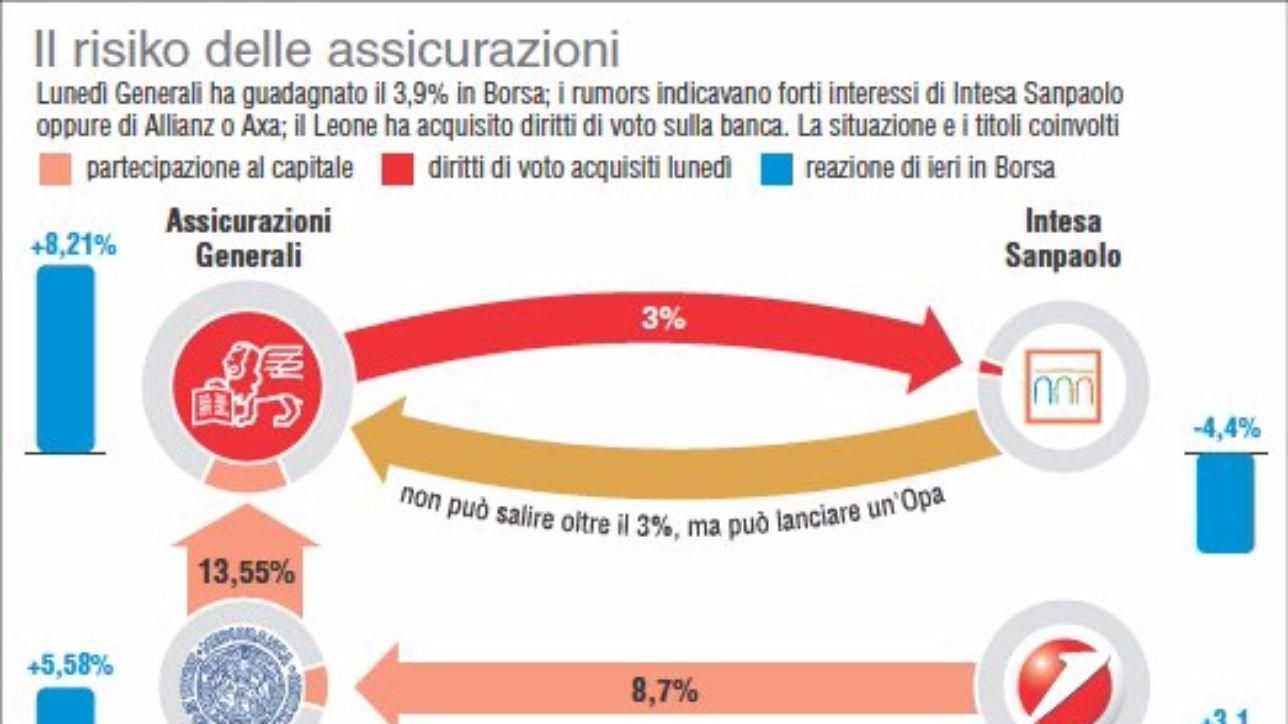 L'acquisto del 3% di Intesa da parte di Generali, non esclude un'opa della banca sulla compagnia di assicurazioni. ANSA Centimetri.