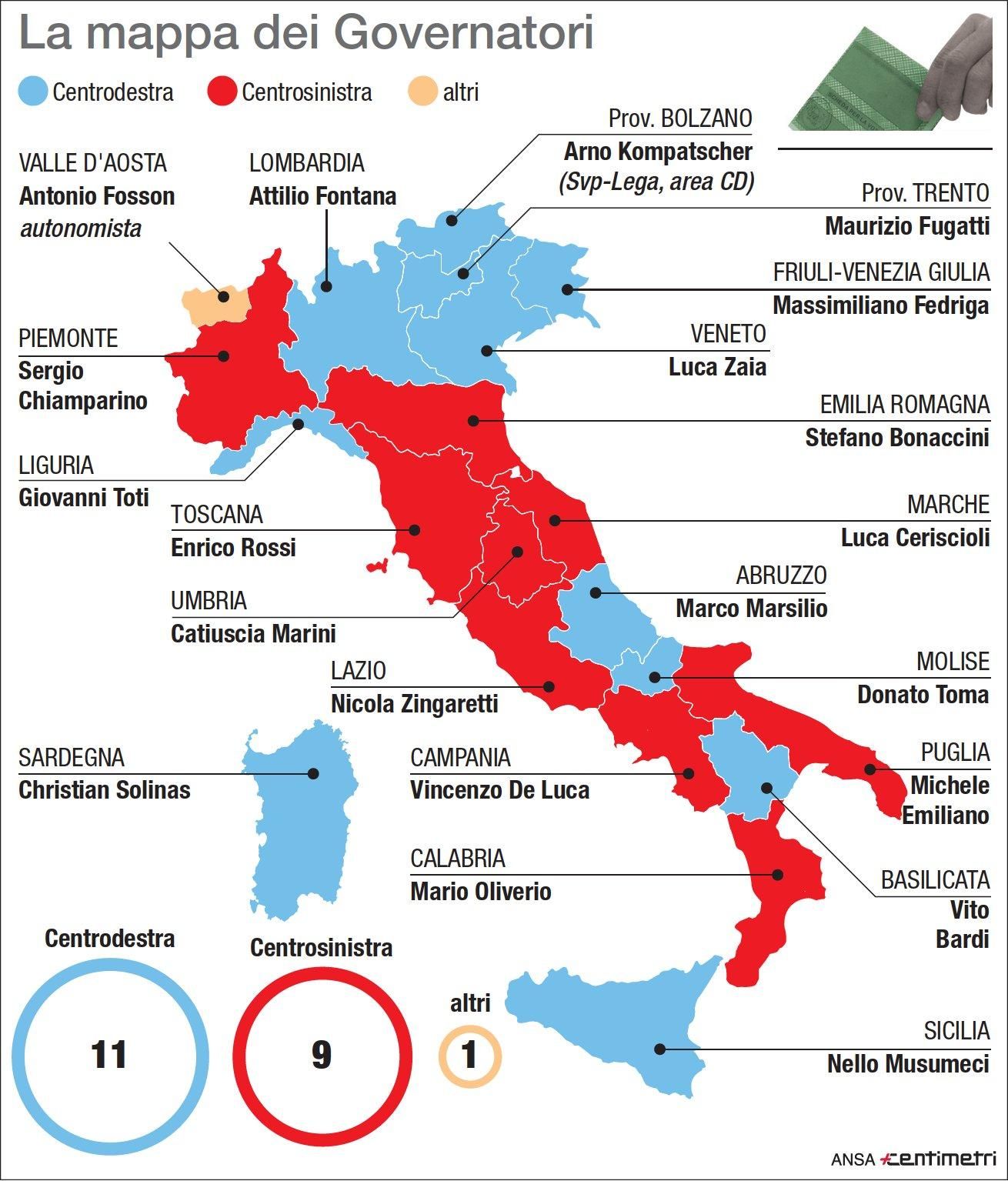 La mappa di tutti gli attuali governatori nelle regioni italiane