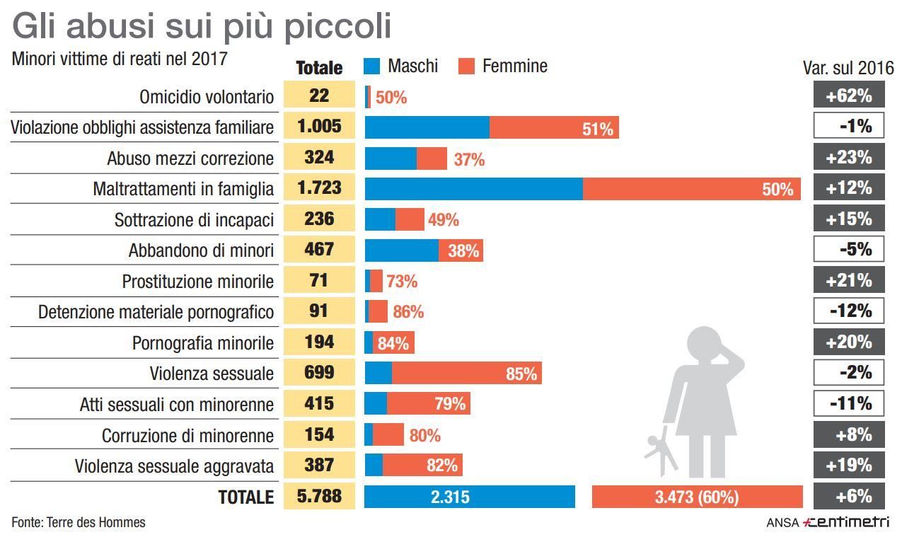 Abusi sui più piccoli, i minori vittime di reati nel 2017