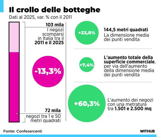 Tra il 2011 e il 2025 l'Italia ha perso oltre 103mila negozi, ma la superficie commerciale complessiva è cresciuta del 7,4% perché i punti vendita sono diventati più grandi, passando da una dimensione media di 117 a 144,5 metri quadrati. I settori più colpiti dalla desertificazione sono alimentari di vicinato, negozi di giocattoli e ferramenta: sono scomparsi oltre 72mila micro-negozi fino a 50 mq e oltre 42.700 esercizi tra 51 e 150 mq, mentre crescono i formati medi tra 151 e 250 mq e si ridimensionano le maxi-superfici. Le dinamiche variano a livello territoriale: regioni come Emilia-Romagna e Abruzzo mostrano crescite marcate della superficie nonostante il calo dei negozi, mentre in Sardegna, Puglia, Basilicata e Valle d'Aosta la superficie è ferma o arretra, testimoniando una riduzione dei servizi che ha già lasciato oltre 1.100 comuni italiani privi di un negozio alimentare specializzato. Secondo Nico Gronchi, presidente di Confesercenti, il commercio fisico non sta semplicemente diminuendo ma si sta riorganizzando, con un costo pesante per i piccoli esercizi indipendenti che costituivano un punto di riferimento per le comunità, e per questo servono politiche che fermino la desertificazione attraverso la rigenerazione urbana, riportando funzioni nei quartieri e fornendo strumenti concreti alle imprese per accompagnare chi può investire e innovare.
