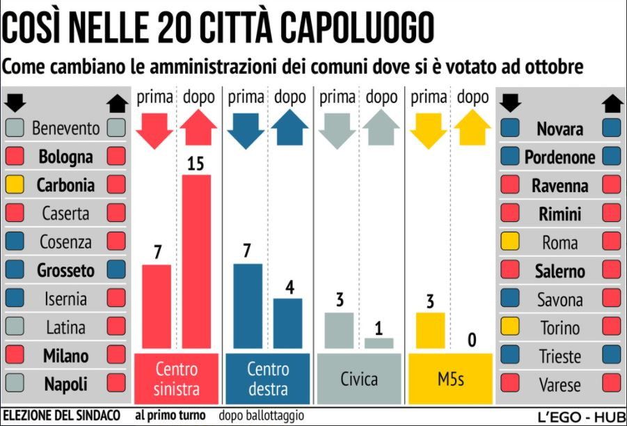Elezioni, ecco come cambiano le amministrazioni nelle 20 città capoluogo