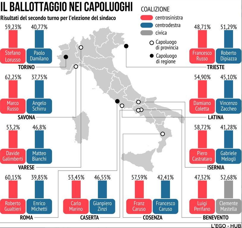 Comunali, 8 ballottaggi su 10 al centrosinistra