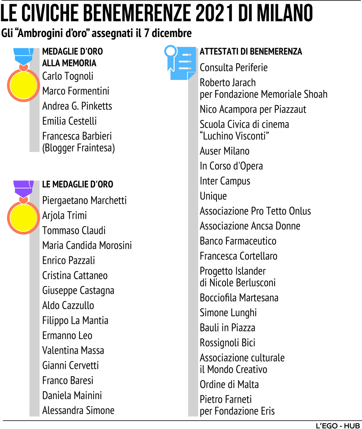 Tra i venti attestati sono stati premiati, tra gli altri, il Progetto Islander della nipote di Silvio Berlusconi, Nicole, che si occupa dei cavalli maltrattati, Banco Farmaceutico, la Civica scuola di Cinema Luchino Visconti, l'Associazione Pro Tetto Onlus, Auser Milano, Nico Acampora con PizzAut, Inter Campus, Bauli in piazza, Roberto Jarach per la Fondazione Memorial.