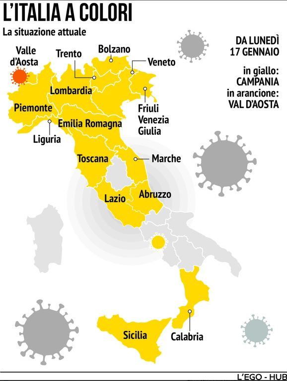 Da lunedì 17 gennaio Valle d'Aosta in arancione e Campania in giallo