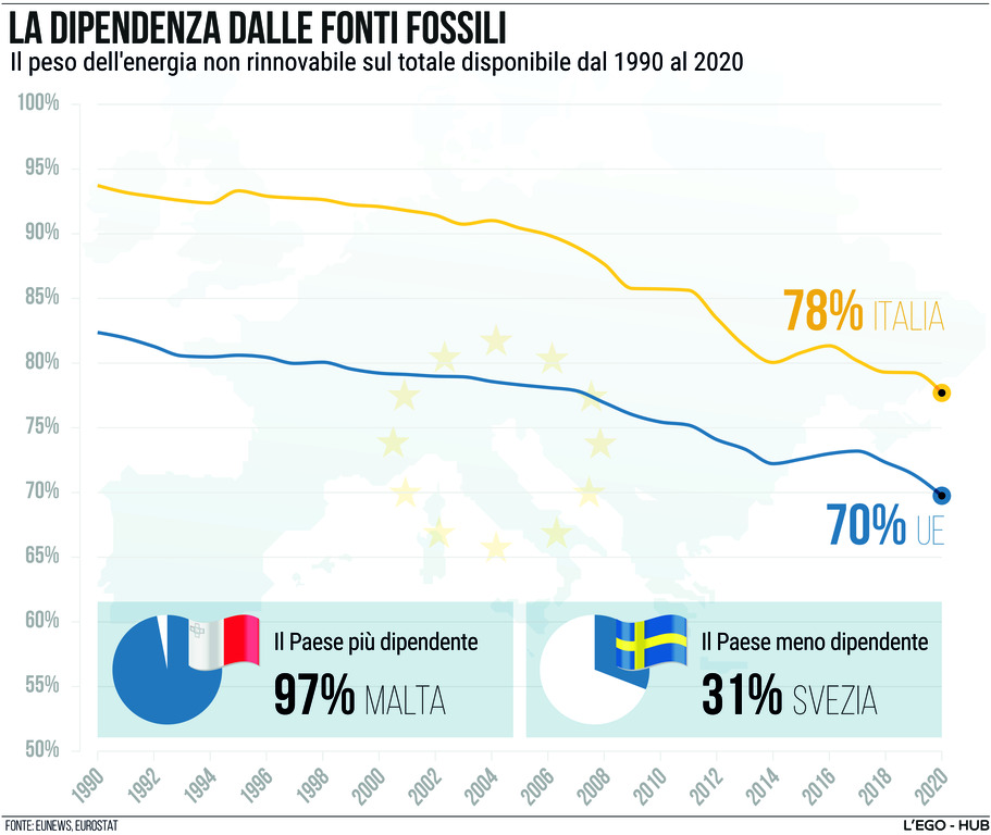 La dipendenza dalle fonti fossili, il peso dell'energia non rinnovabile sul totale disponibile